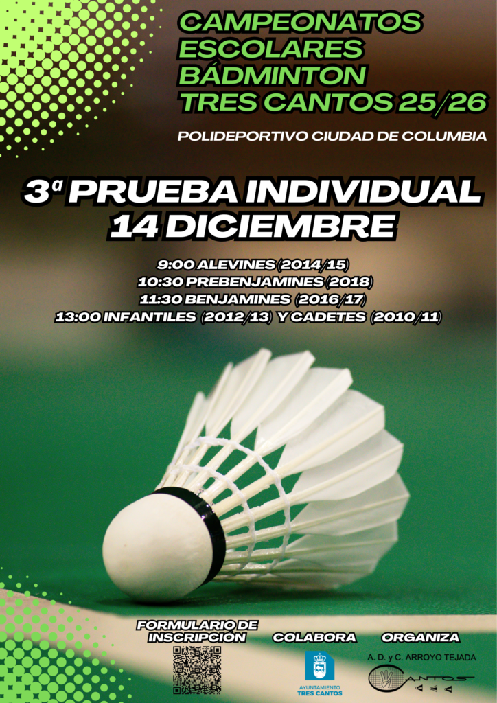 En la prueba pueden participar todos los escolares de Tres Cantos que hayan nacido en los años que marcan las diferentes categorías, sin importar el nivel que tengan de Bádminton. A través de los diferentes campeonatos que organizaremos durante el curso escolar 2025-26 buscamos fomentar la práctica del Bádminton y disfrutar de su juego y todos los valores que transmite.