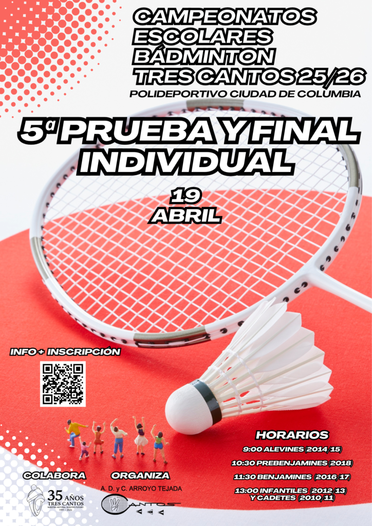 En la prueba pueden participar todos los escolares de Tres Cantos (y jugadores de fuera invitados por la organización) que hayan nacido en los años que marcan las diferentes categorías, sin importar el nivel que tengan de Bádminton. A través de los diferentes campeonatos que organizaremos durante el curso escolar 2025-26 buscamos fomentar la práctica del Bádminton y disfrutar de su juego y todos los valores que transmite.