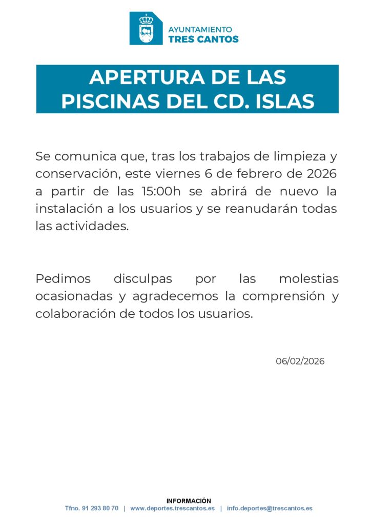 Tras los trabajos de limpieza y conservación, este viernes 6 de febrero de 2026 a las 15:00 se abre de nuevo la instalación a los usuarios.