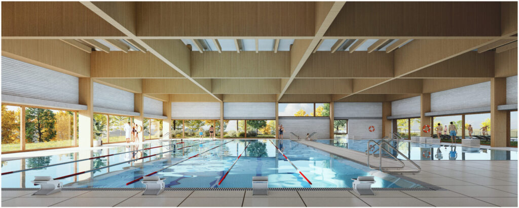 En una superficie de 2.720 m2 sobre rasante, el complejo se distribuirá en tres niveles: un sótano destinado a instalaciones, una planta principal –que albergará piscinas cubiertas, piscina exterior, zona de aprendizaje acuático y piscina polivalente para diferentes usos y funcionalidades– y una planta superior con un gimnasio dotado de salas fitness, bicicletas multiusos y un mirador con vistas al parque.